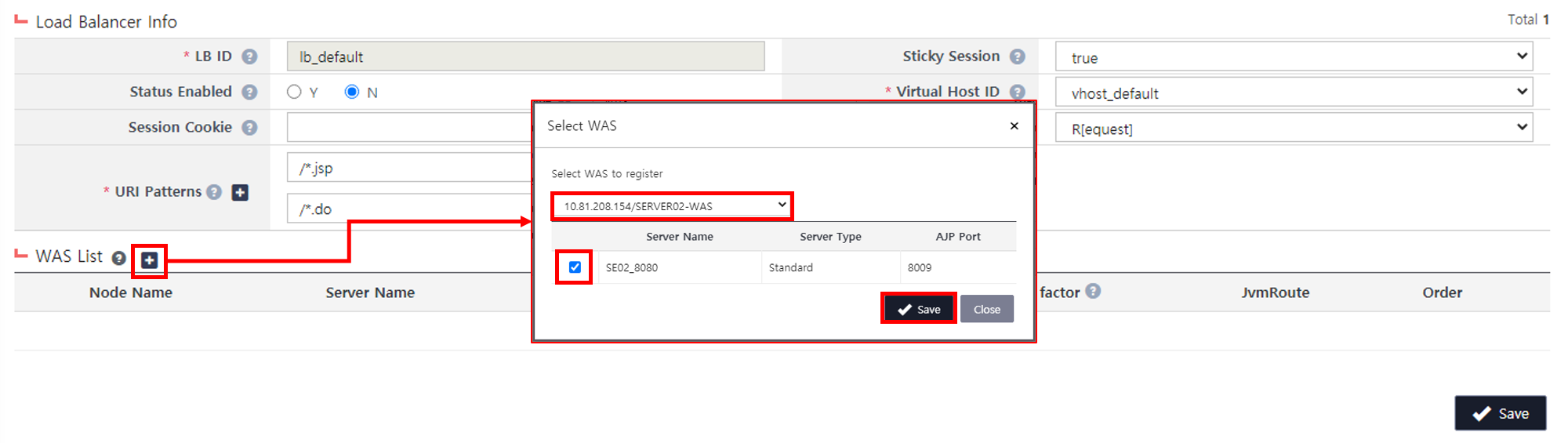 WAS List에 연동 설정할 WAS가 추가되면 우측 하단의 'Save' 버튼을 클릭하여 최종 저장한다.