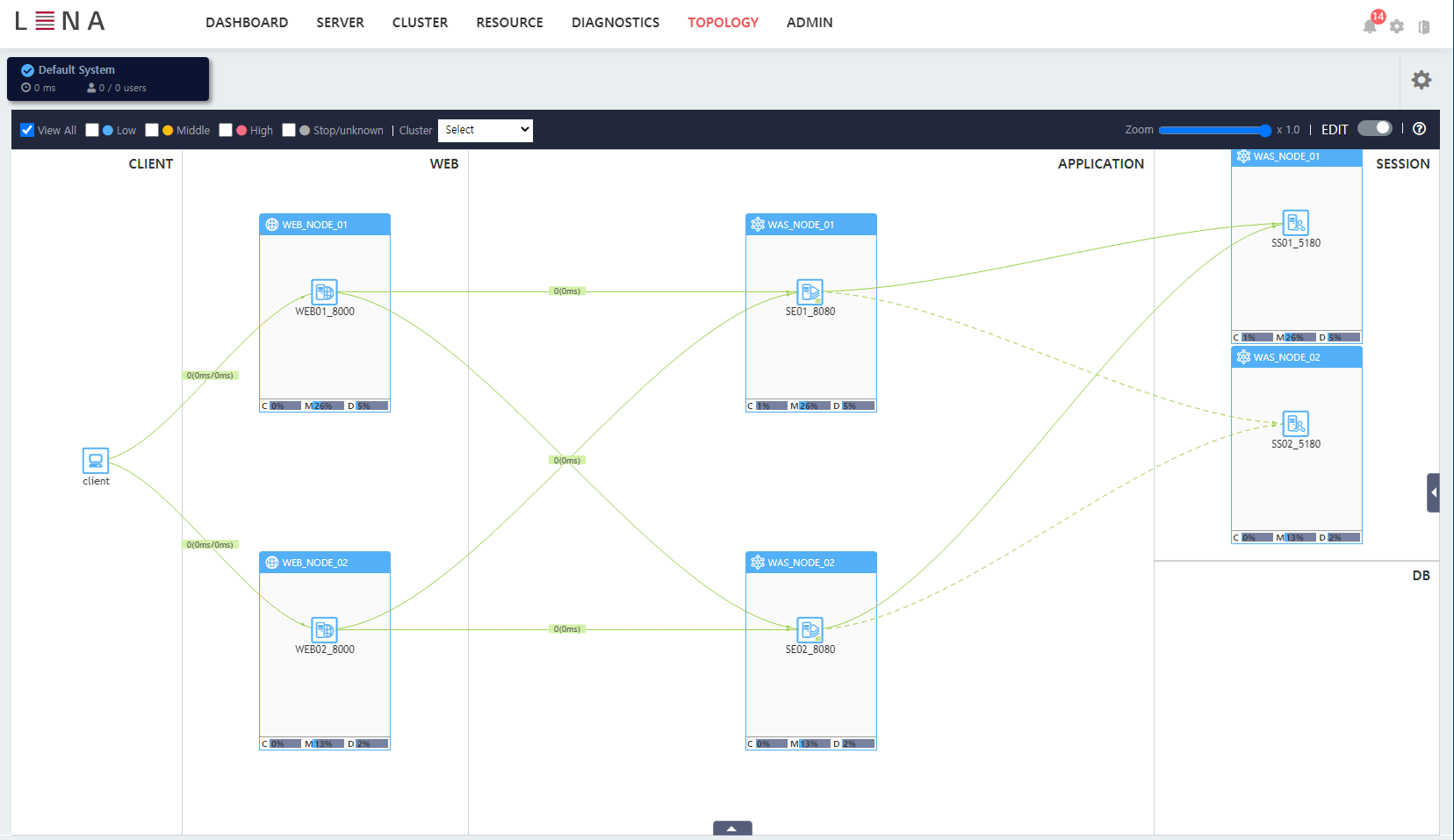 Topology View 에서는 기본적으로 현재 등록되어 있는 Node 와 Node 별 설치한 Server 의 구성과 연동정보를 확인 할 수있다.