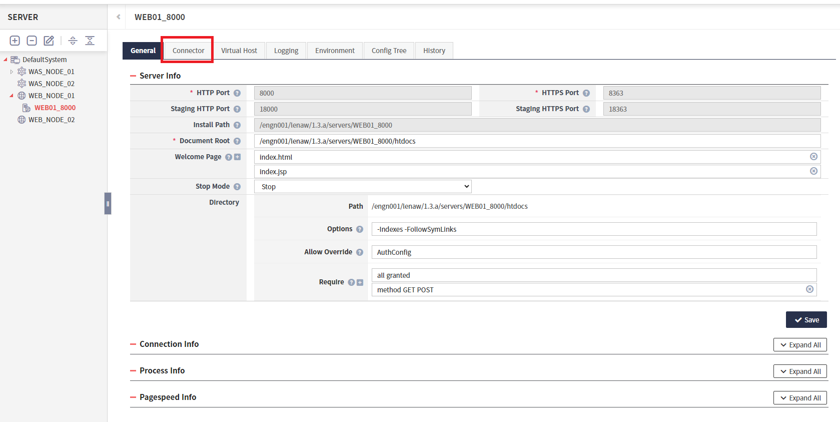 Web Server 의 'Connector' 탭에서는 Web Server 와 WAS 간 연결에 대한 설정을 관리한다.